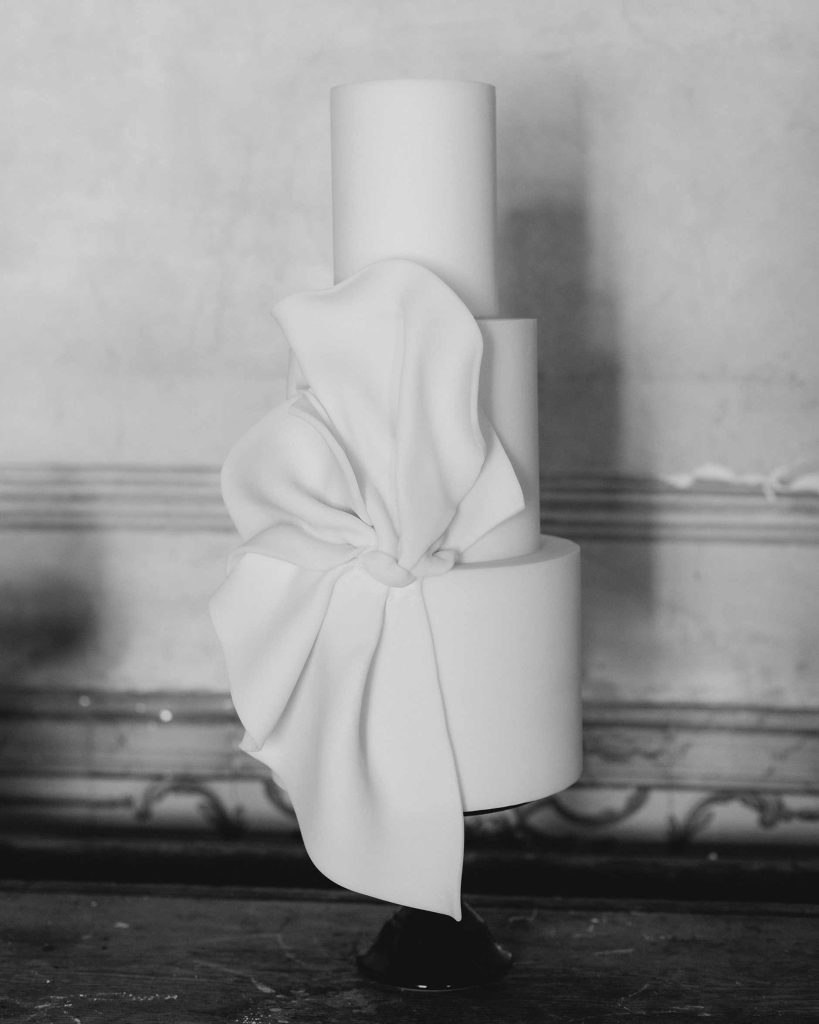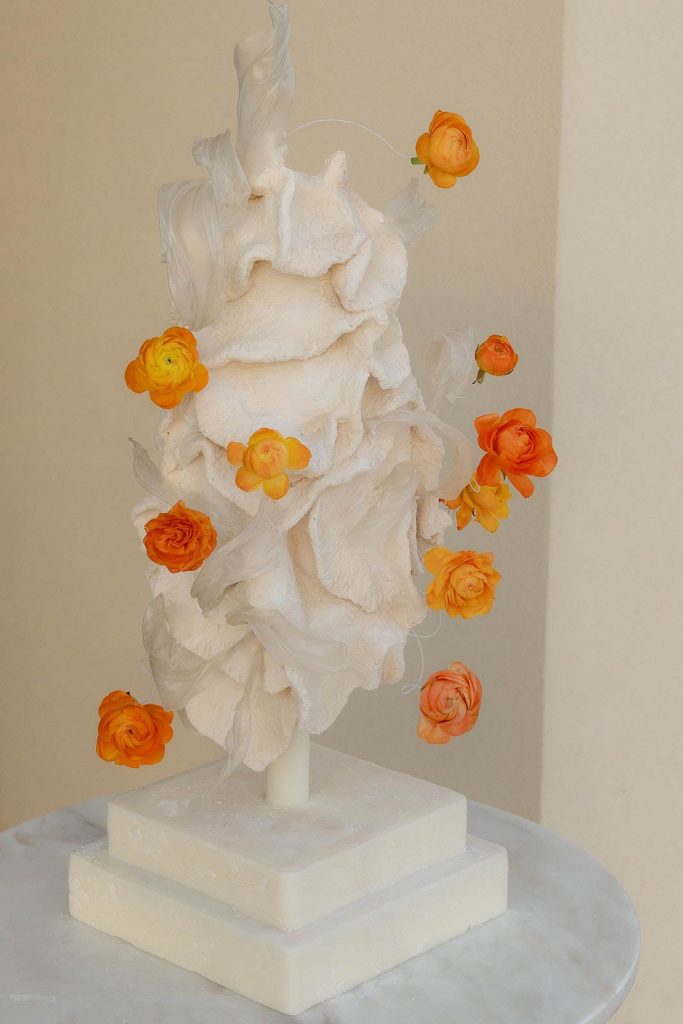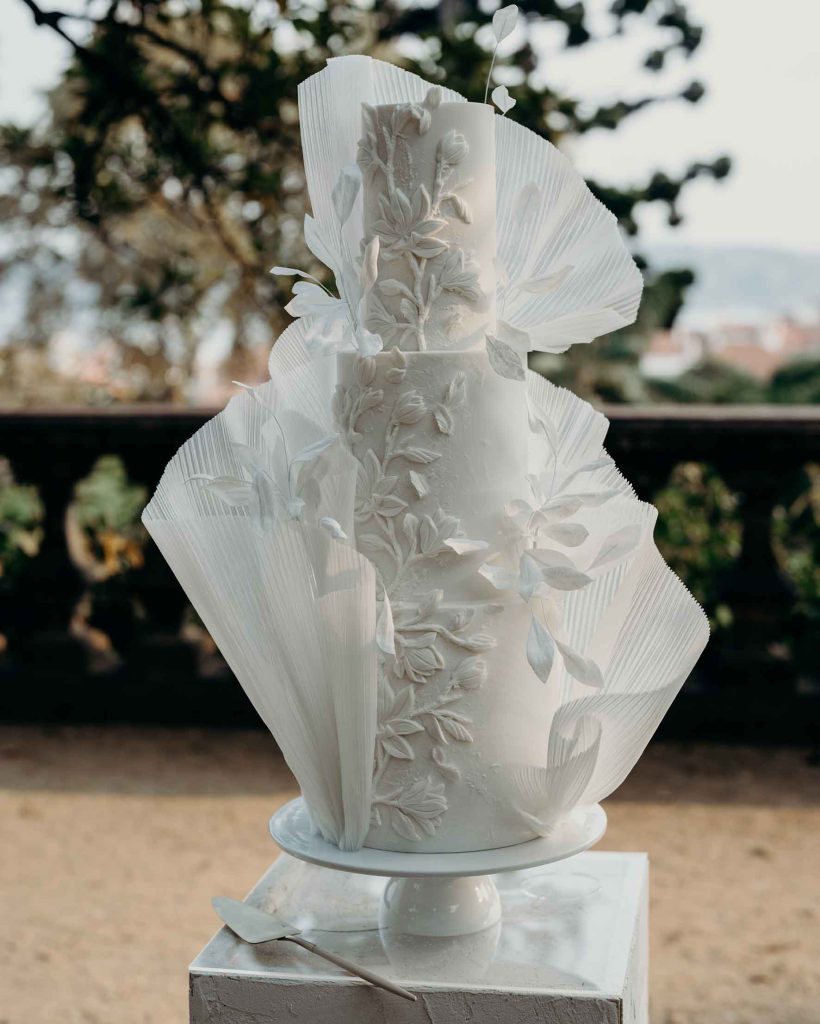 A inspiração vem, muitas vezes, de elementos inesperados: texturas naturais como pedra ou mármore, o toque delicado da cerâmica artesanal, formas escultóricas, o cair suave de um tecido, pormenores arquitectónicos e até detalhes do vestido da noiva. Gosto de explorar referências artísticas fora do universo habitual do cake design e, por exemplo, adaptar uma técnica de cerâmica a uma linguagem comestível. Para mim, o bolo de casamento é mais do que uma sobremesa, é uma peça efémera de arte que encerra um simbolismo e uma beleza muito especiais.